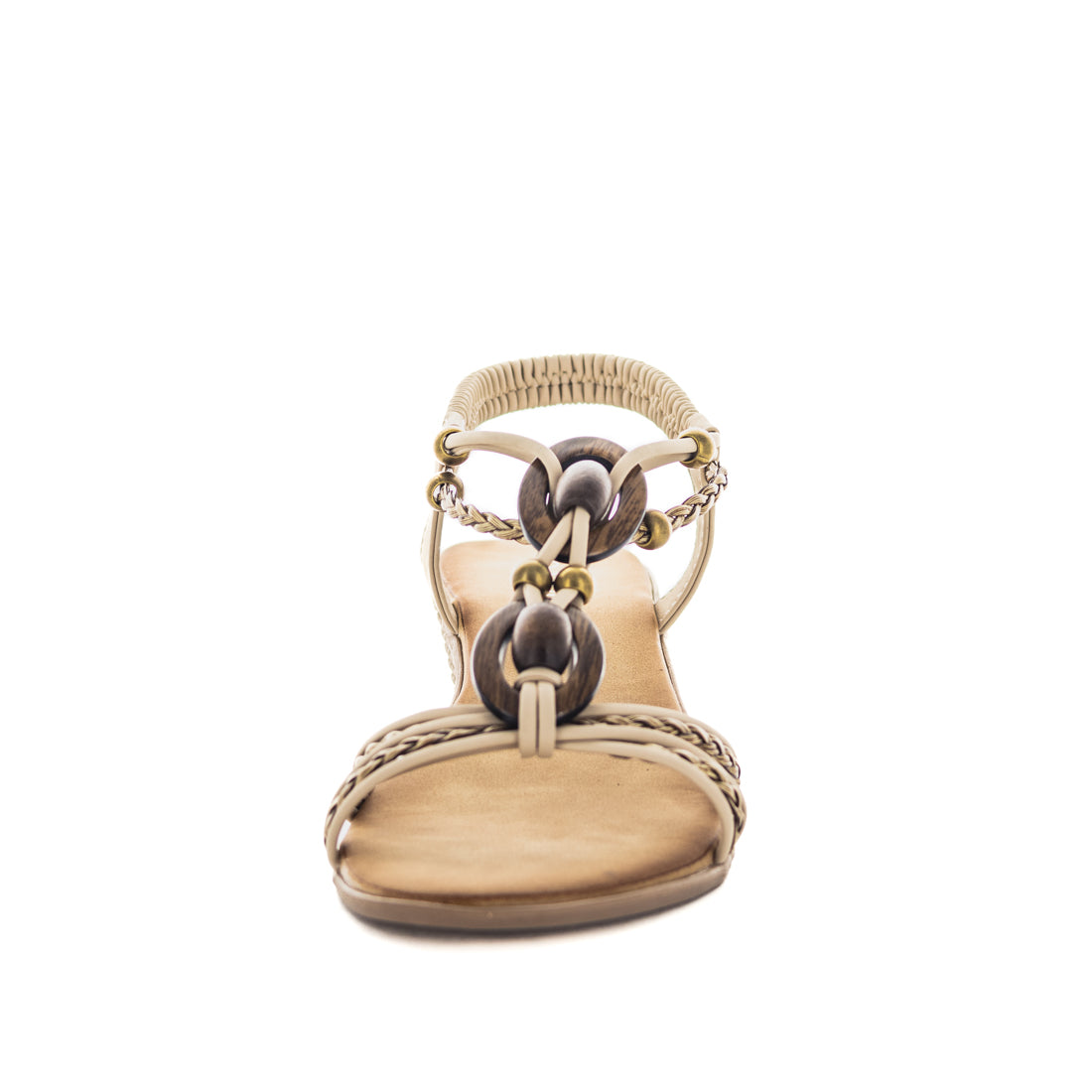- Beaded & wood trim with plaited crossover straps
