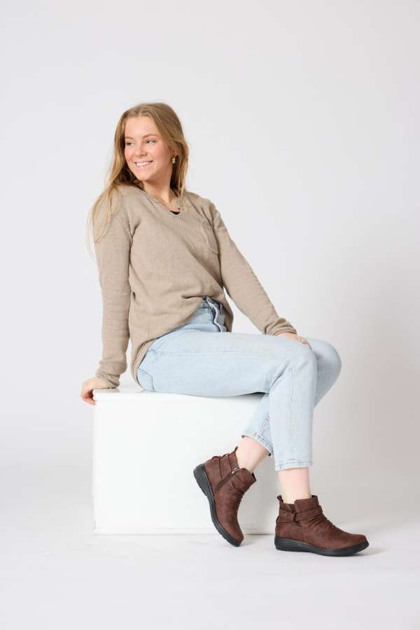 Expertly crafted and stylish, the MARCELLA ruched ankle boot features a strap trim and inside zip access for convenience. With a removable moulded foam padded sock, lightweight and flexible outsole, and a 35mm wedge, youll experience comfort and style with each step.