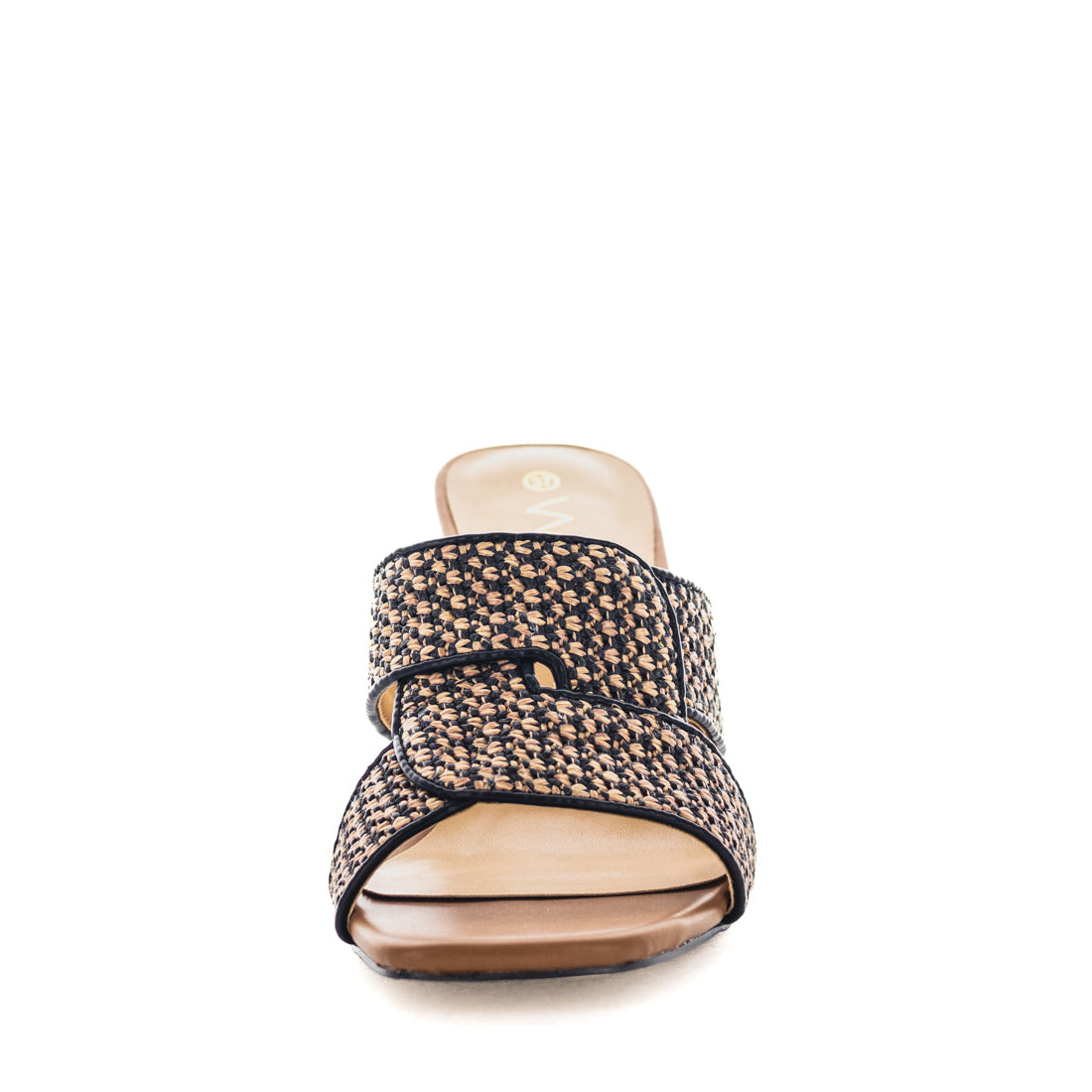 Elevate your style with the Wildes Sayo, featuring raffia-entwined slide-on straps for a unique, sophisticated look. The padded insole ensures comfort during extended wear, while the durable outsole provides reliable traction. Standing at a 75mm height, these heels offer the perfect balance of elegance and stability for any occasion.